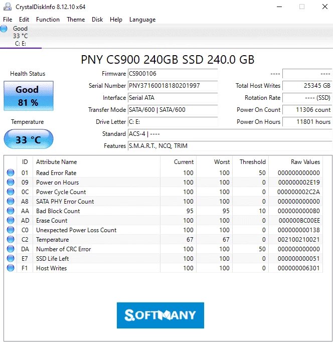 S.M.A.R.T (Self-Monitoring, Analysis, and Reporting Technology) is a built-in feature available in hard drives and SSDs. It enables the users to track different parameters such as temperature, read & write errors, power-on hours, and a lot of others. The entire procedure is simple, as all connected storage devices with your computer are displayed here, and the general health status with estimated percentage for SSD drives is available on the left of the screen. It will alert you in case of failure of any drive, and enables you to back up data before the drive fails. In addition, you are capable of watching the serial number, firmware, interface, letter assigned to the unit, and so on.